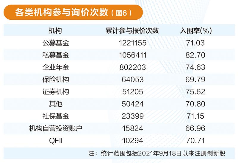从各类机构询价次数来看,公募基金、私募基金打新积极性较高。2021年9月询价新规发布后上市的注册制新股中,公募基金、私募基金合计询价均超百万次,分别为122.12万次和105.64万次;企业年金参与询价次数位居第三名,达80.22万次。