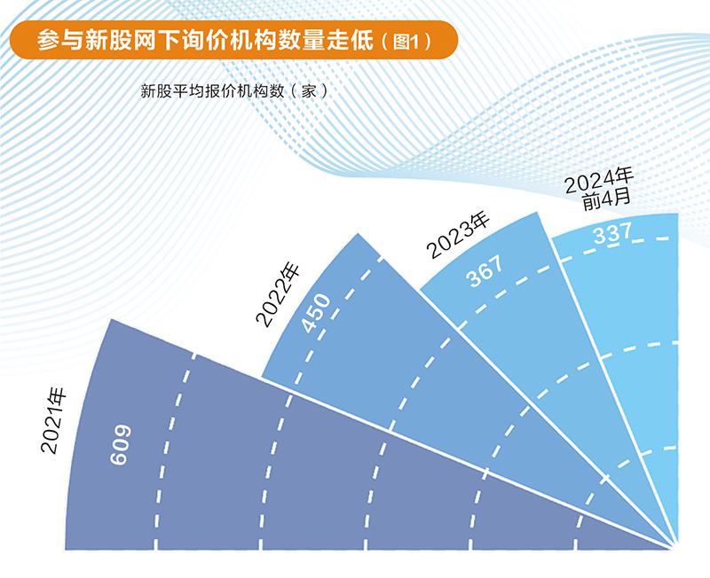 2022年和2023年,单只新股平均参与询价的机构数量进一步降低,分别降至450家和367家,2024年前4个月份,这一数据再下降至337家。以今年前4个月均值,较新规发布前的数据相比,询价机构数量下降47%(图1)。