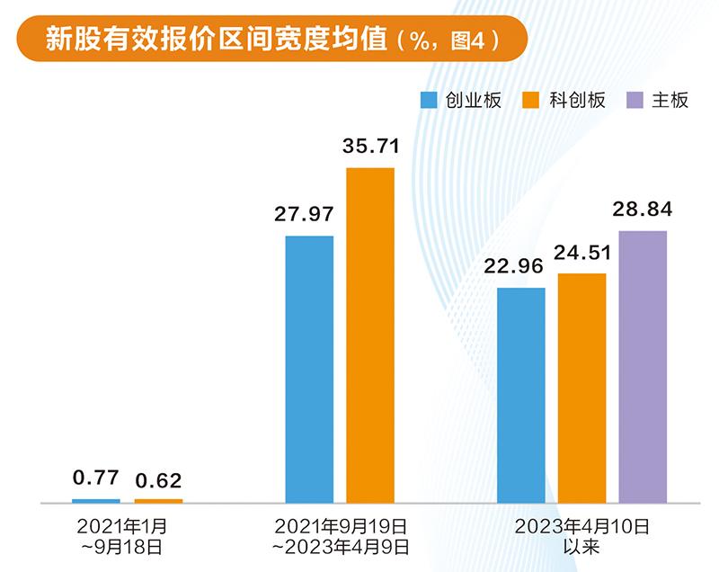 全面注册制之后,主板注册制新股定价取消23倍的市盈率上限,投资者询价报价集中度也随之分散,有效报价数量激增,例如2023年11月7日上市的麦加芯彩,有效报价机构数达340家,有效价格数量多达368个,有效报价区间宽度达54.29%(图4)。