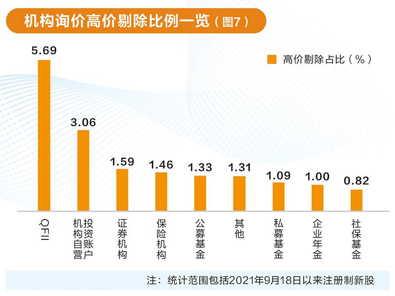 2021年9月后上市的注册制新股中,公募基金和私募基金因高报价格被剔除次数较多,均超万次。但从高价剔除次数占报价次数的比例来看,QFII报价最为激进,1.03万次报价中有586次被高价剔除,剔除比例达5.69%;其次是机构自营投资账户,高价剔除比例为3.06%;其他机构高价剔除比例多数落在1%~2%之间(图7)。