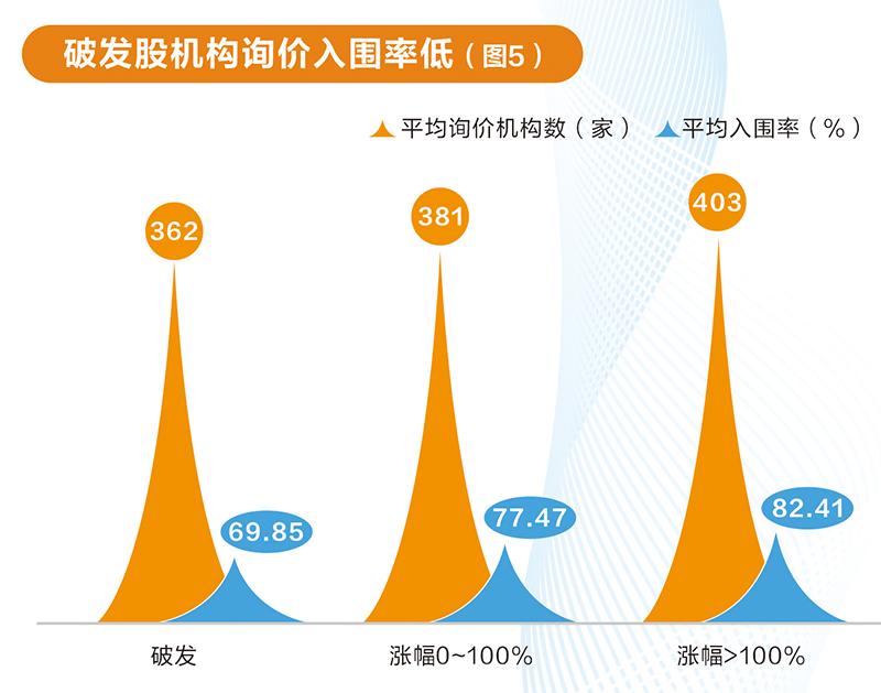 分区间统计显示,2021年以来上市的注册制新股中,破发股的询价机构家数平均值为362家,入围率为69.85%,两项指标均低于上市首日股价上涨的新股组合。上市首日股价翻番的新股平均询价机构数量最高,达到403家,平均入围率也是最高,超过82%(图5)。