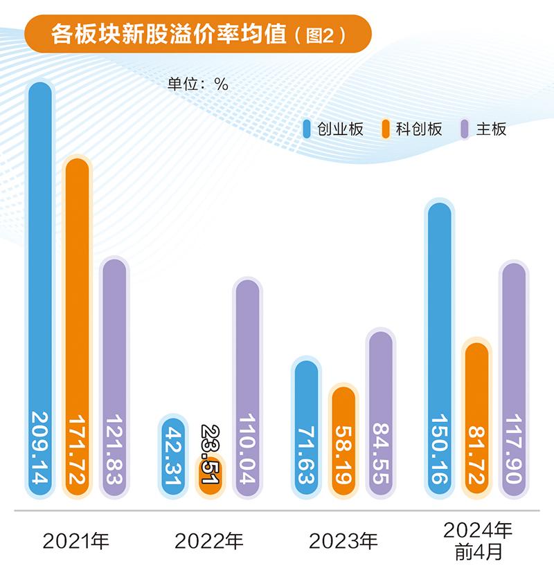打新不再是稳赚不赔的投资。2021年以来,新股上市初期溢价率(新股首日成交均价相比发行价涨跌幅,核准制新股按开板日成交均价统计)整体呈现走低,甚至有多个月份出现负值,包括2022年4月科创板新股溢价率为-10.14%,2023年4月创业板新股溢价率为-3.31%,2023年10月科创板新股溢价率为-13.23%,打新收益在大幅度缩水。不过,今年以来,随着行情好转,新股溢价率又有所提升(图2)。